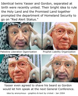I think the cartoon comparing Yasser Arafat with Gordon B. Hinckley is tasteless. It completely trivialises the intolerable conditions many Palestinians are forced to live under, overcrowded conditions, military attack, poverty, unemployment, demolition of homes etc